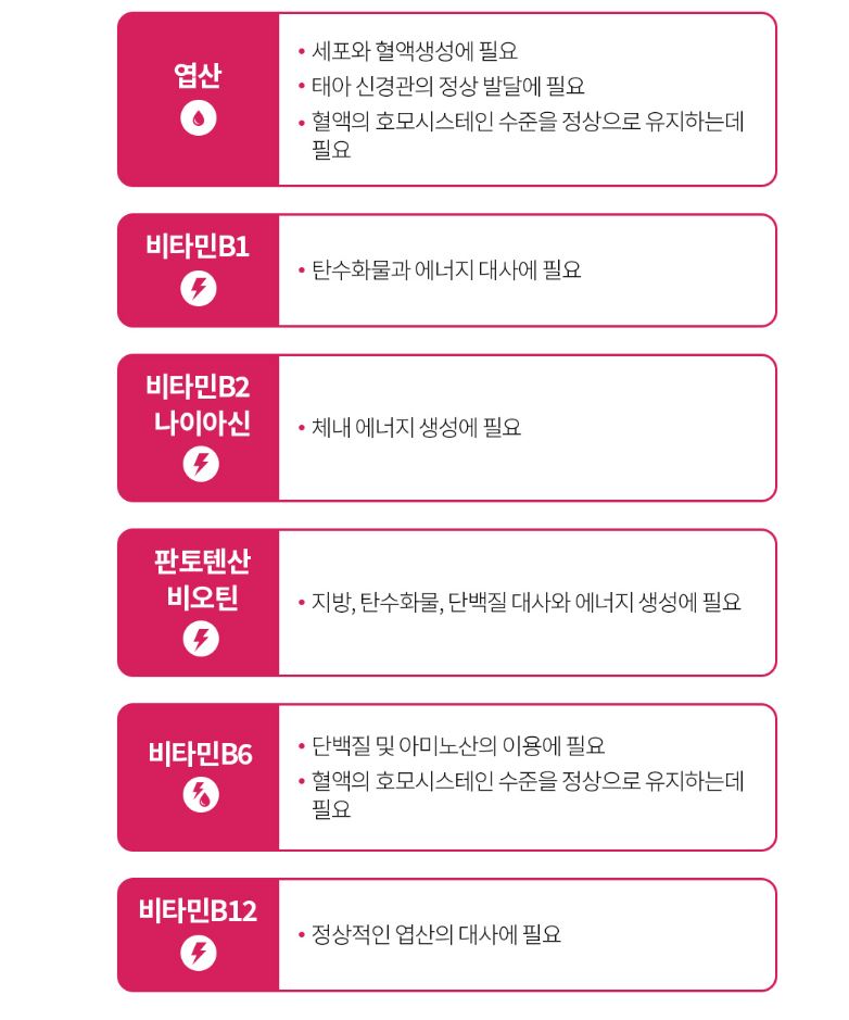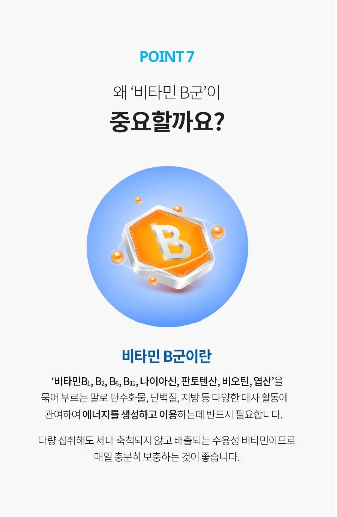 비타민B1, 비타민B2, 나이아신, 판토텐산, 비타민B6, 비오틴, 엽산, 비타민B12