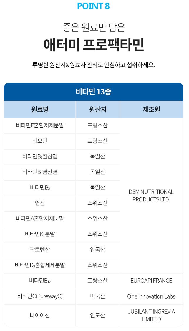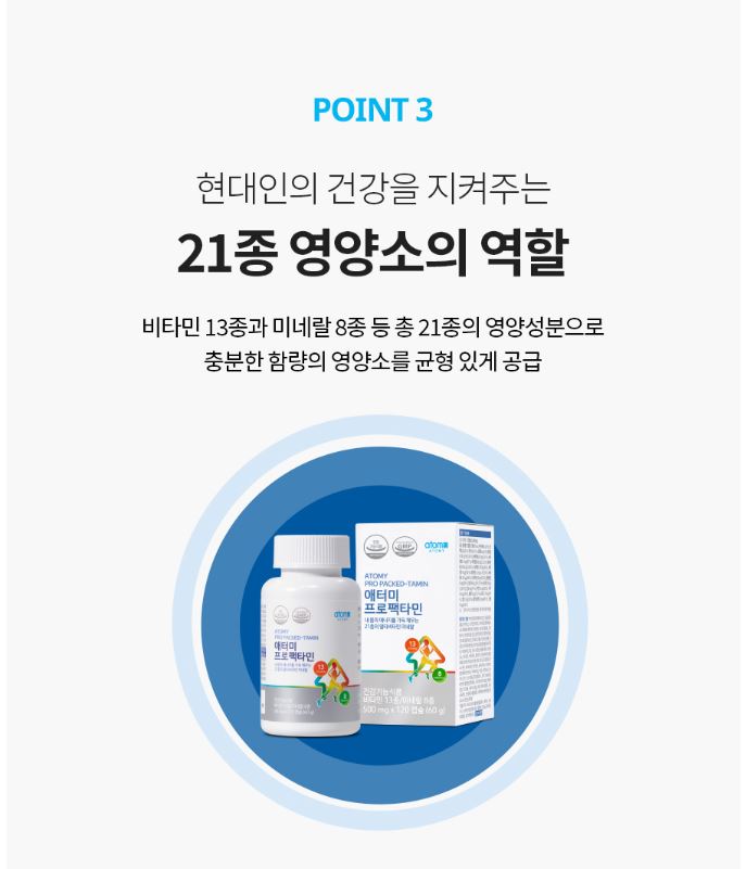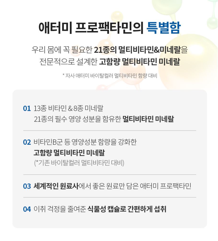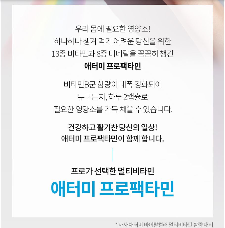 애터미프로팩타민은 13종의 비타민과 8종의 미네랄을 꼼꼼히 챙긴 고함량종합비타민 제품입니다.