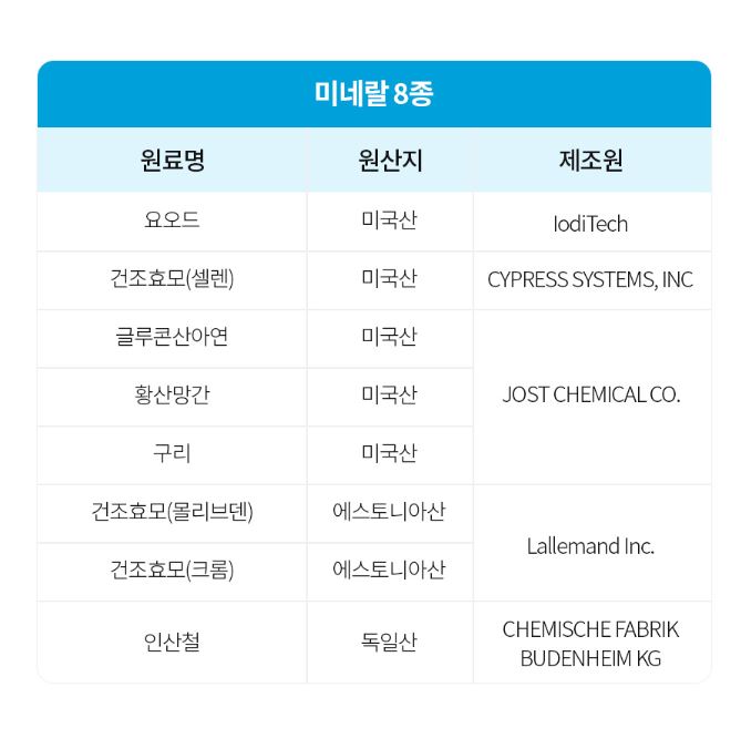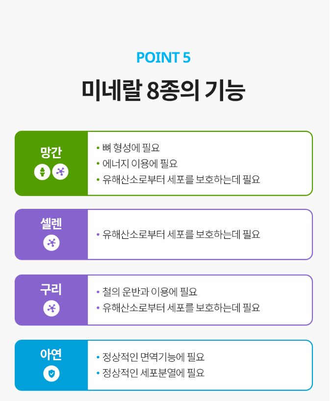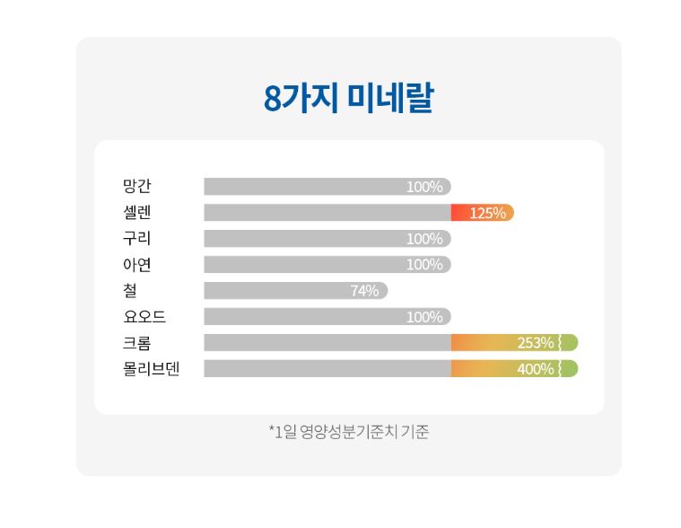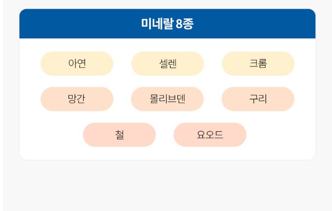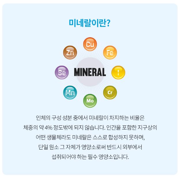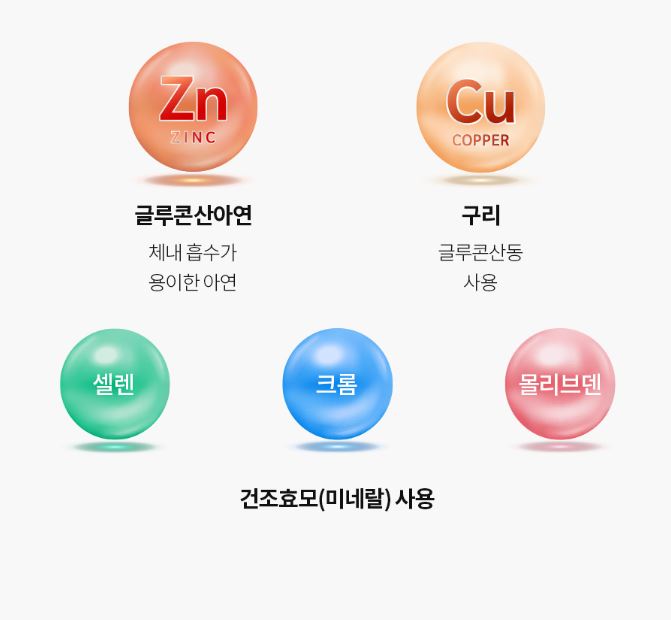 아연, 셀렌, 크롬, 망간, 몰리브덴, 구리, 철, 요오드