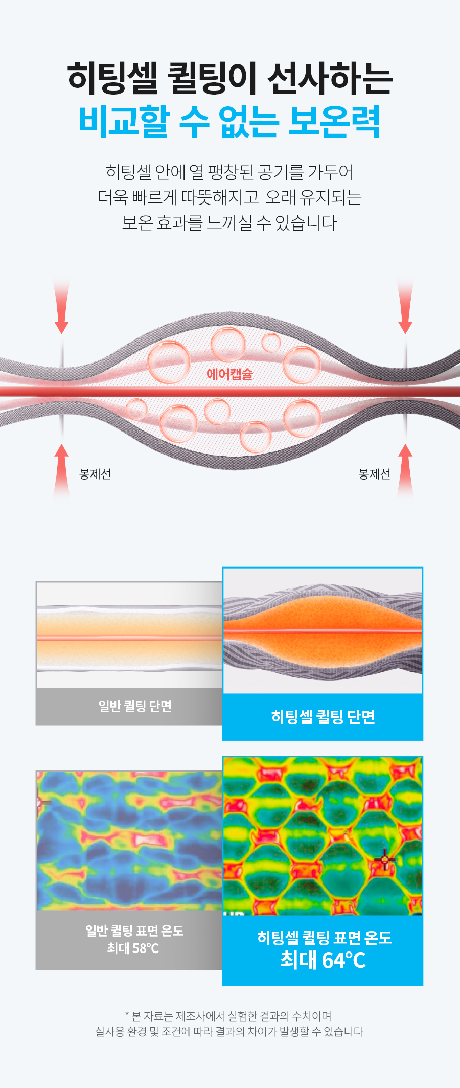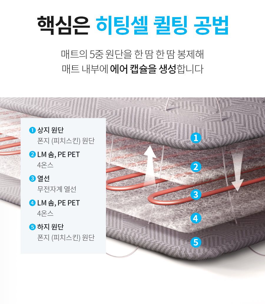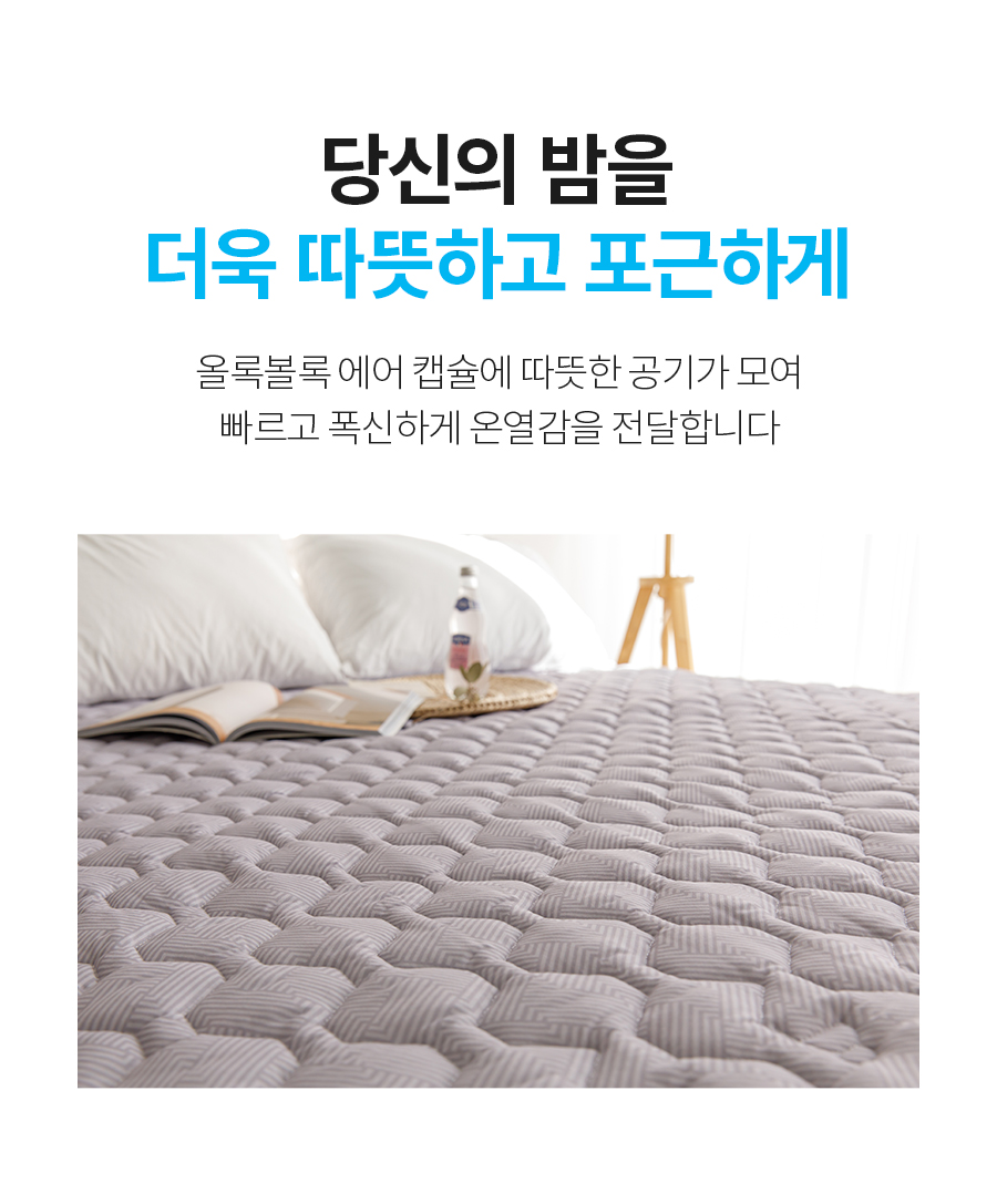 애터미 히팅셀 퀼팅 공법으로 공기층에 따뜻한 공기가 모여 빠르게 온기를 전달해줍니다.