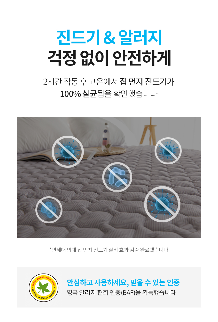2시간 작동 후 고온에서 집먼지 진드기가 100% 살균됩니다.