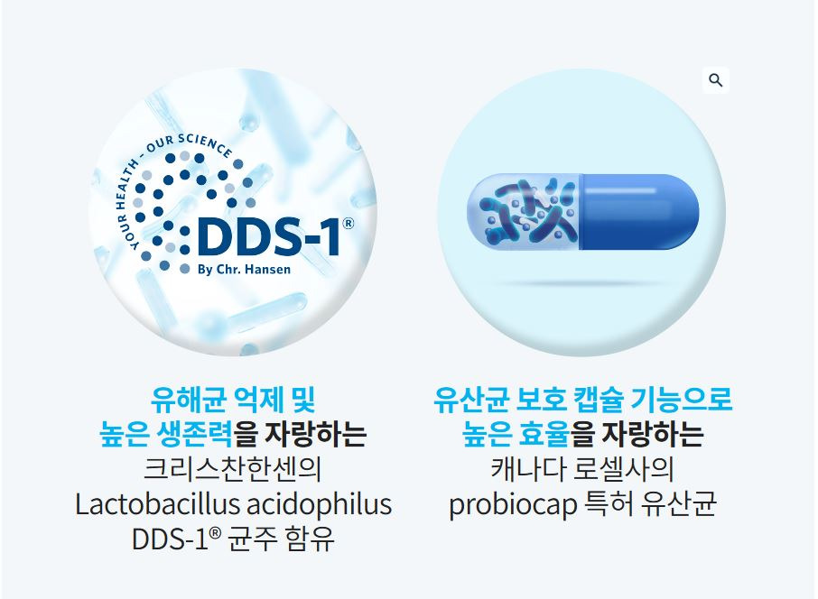 유산균 보호 캡슐 기능으로 높은 효율을 자랑하는 캐나다 로셀사의 프로바이오캡 특허윤산균이 함유되어 있습니다.