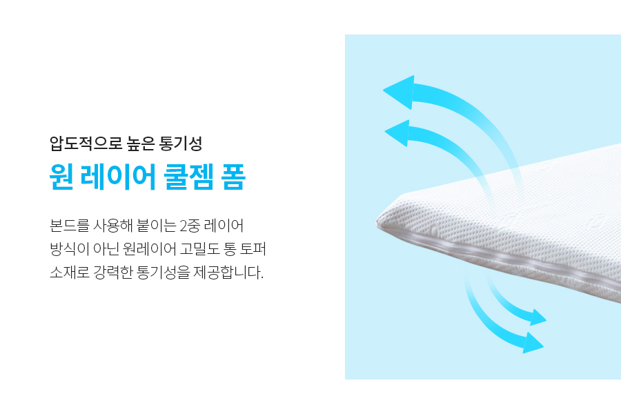 본드를 사용해서 붙이는 2중 레이어 방식이 아닌 원레이어 고밀토 통 토퍼 소재로 강력한 통기성을 제공합니다.
