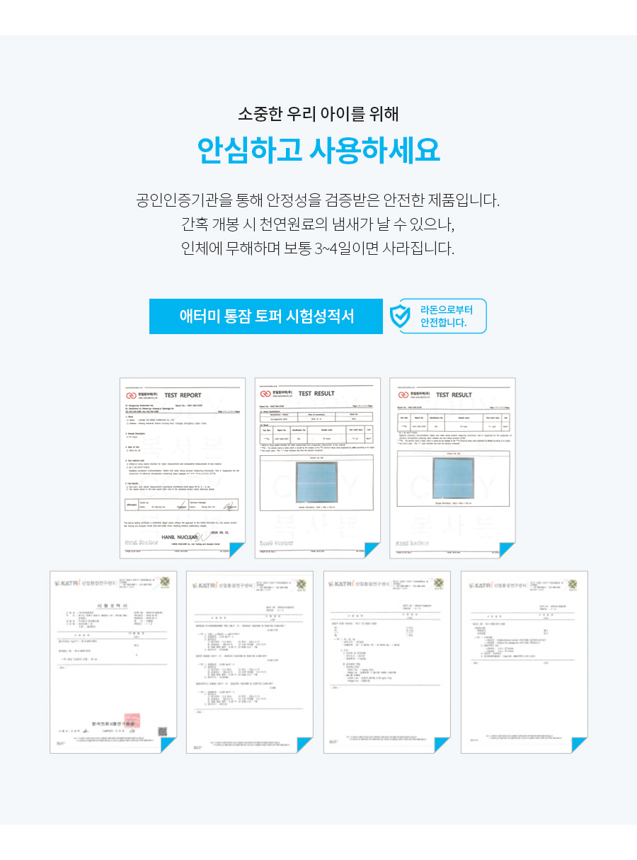 애터미 통잠토퍼 매트리스는 까다로운 시험을 통과한 시험성적서를 제시하고 있어서 제품에 대한 신뢰도를 더욱 상승시켜 줍니다.