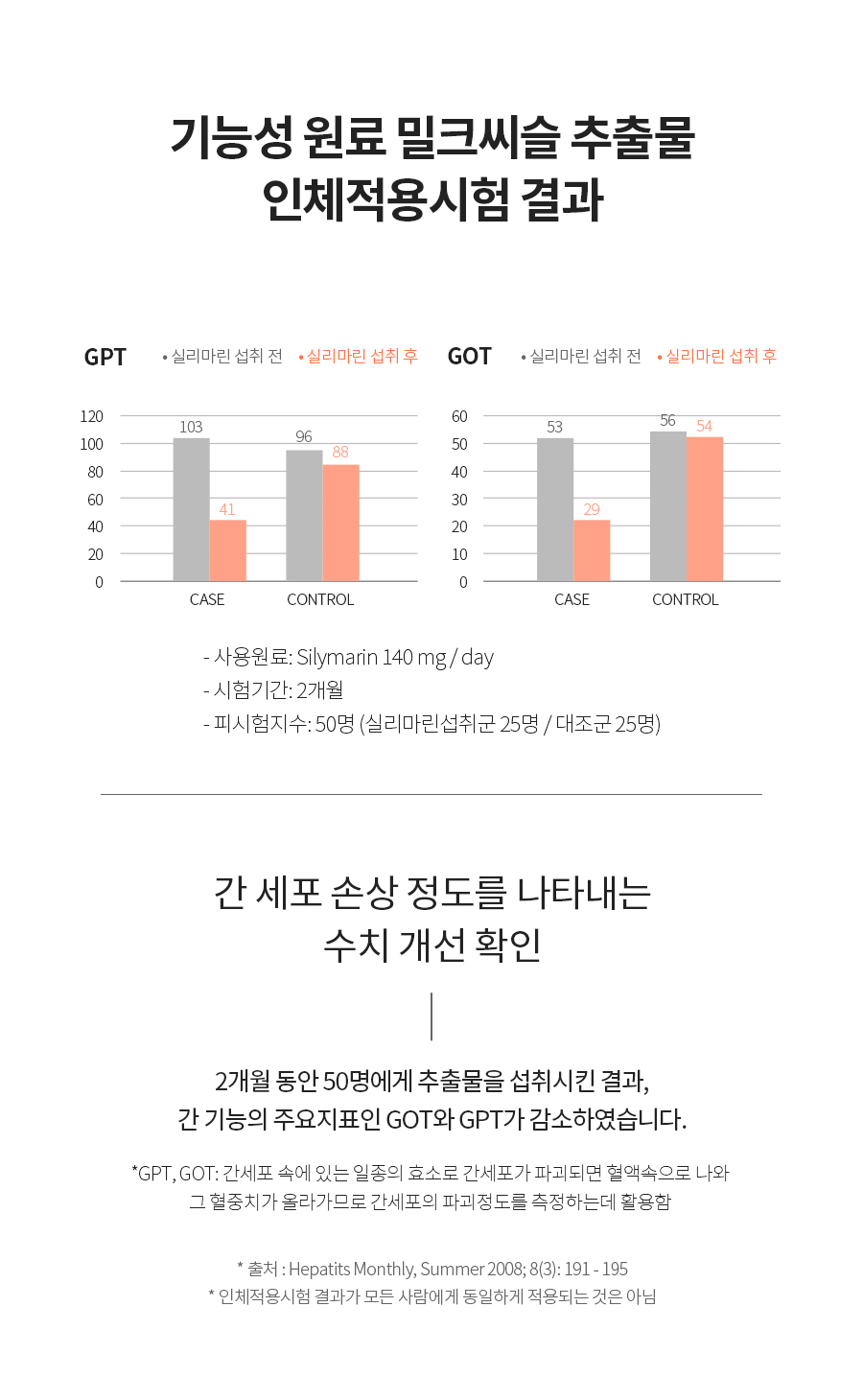 섭취한 군에서 간세포를 죽이는 효소의 수치가 줄어든 것을 확인했습니다.
