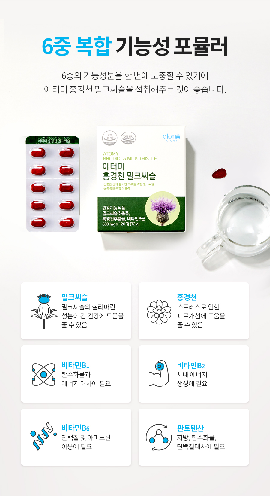 밀크씨슬, 홍경천, 비타민B1, 비타민B2, 비타민B6,판토텐산 등의 성분이 들어 있습니다.