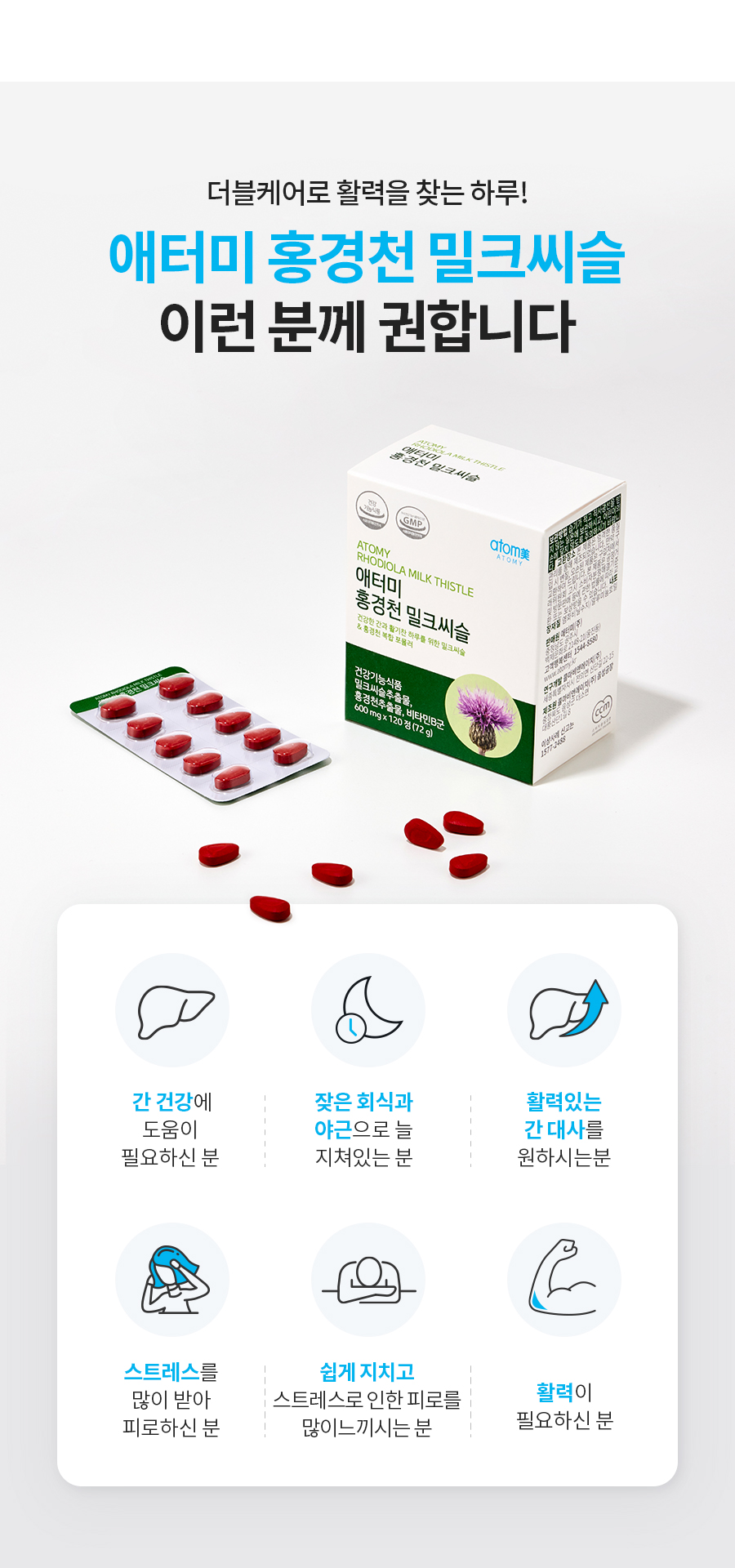 물론 밀크씨슬은 약은 아니지만...내 몸이 다른 사람과 다르게 쉽게 피로를 느끼고 있다면 건강기능식품의 도움을 받아 피로를 개선하는 것이 좋습니다.