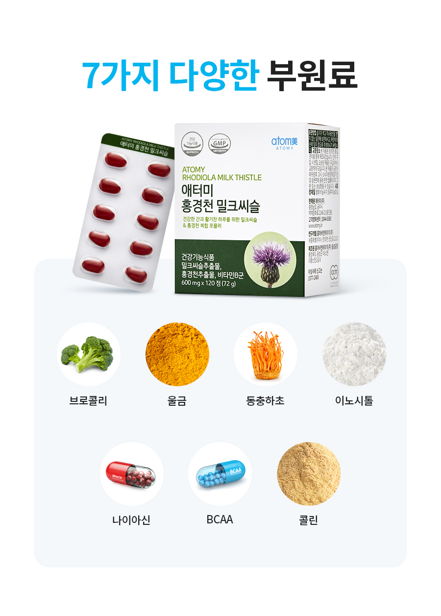 애터미 홍경천 밀크씨슬 안에는 7가지 다양한 부원료가 들어 있어요.